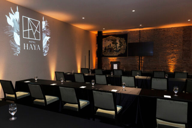 The Valencia Ballroom’s architecture, featuring soaring two-story room heights and maximum natural light, is further enhanced by impeccable details that include whitewashed brick walls, herringbone wood floors, and custom blown glass chandeliers.